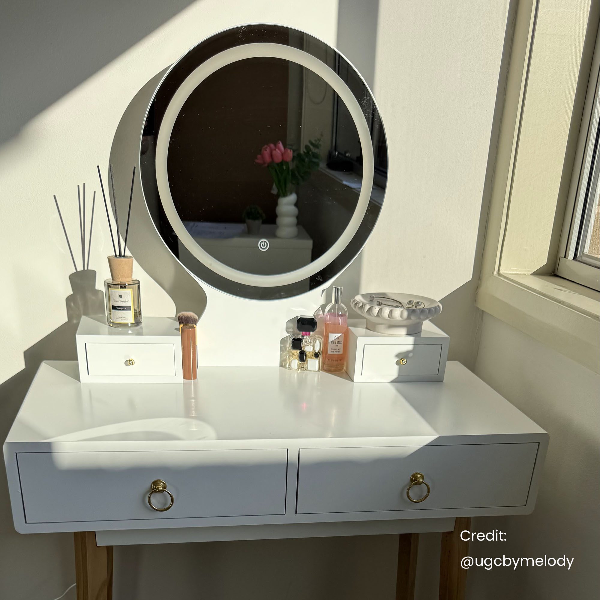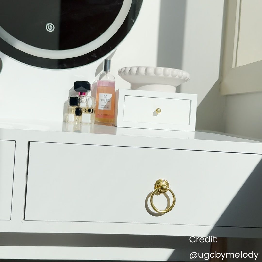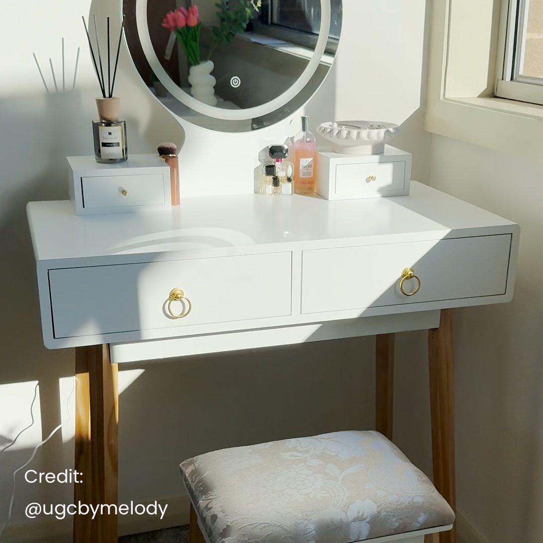 This stylish and practical vanity table set features a mirror with touch-controlled LED lighting, making it ideal for daily grooming tasks. With three adjustable light settings, you can achieve the perfect lighting environment whether morning or evening. The set includes spacious drawers to help you organise personal items, skincare, and accessories. Smooth-sliding rails and a classic French-inspired handle design add to both usability and charm.