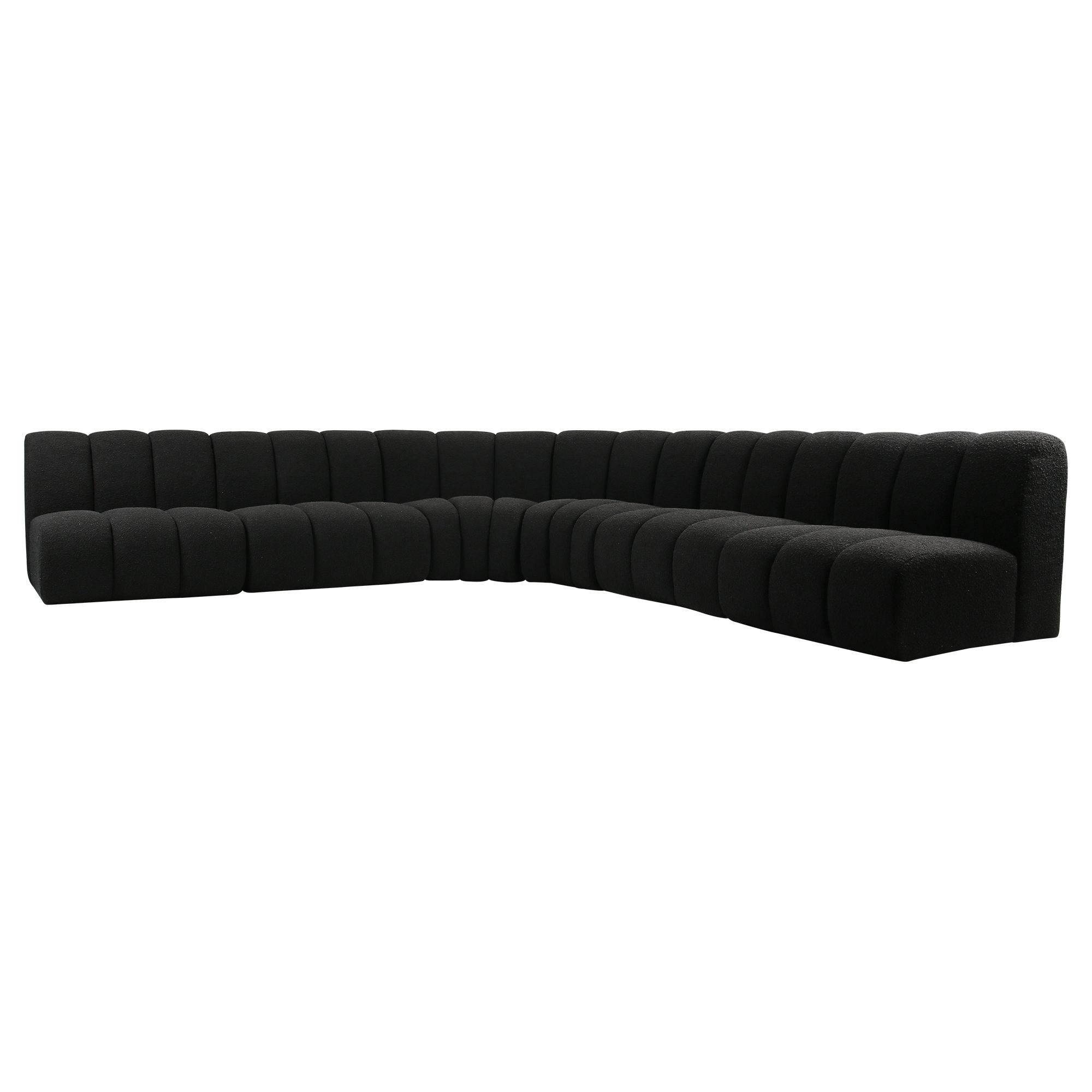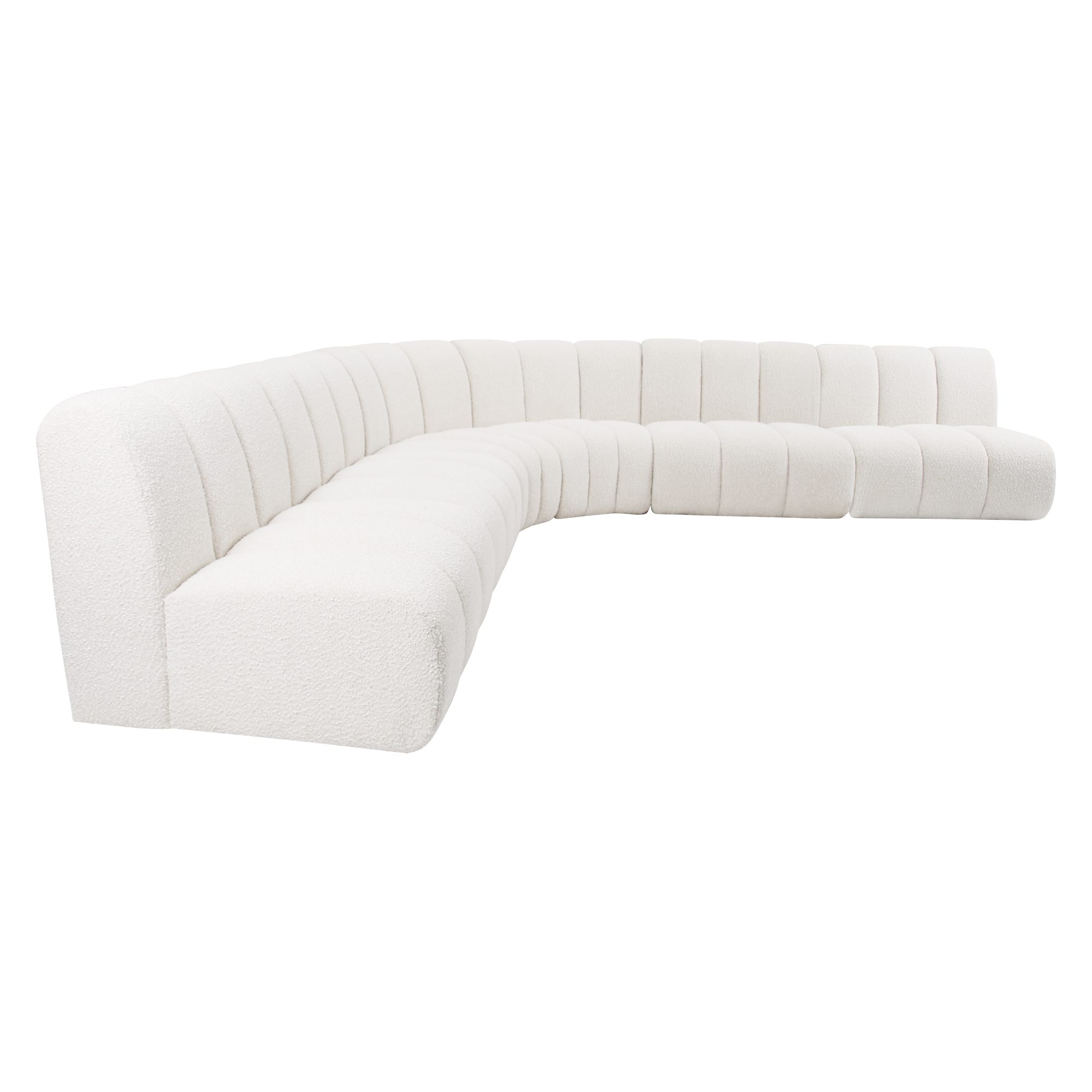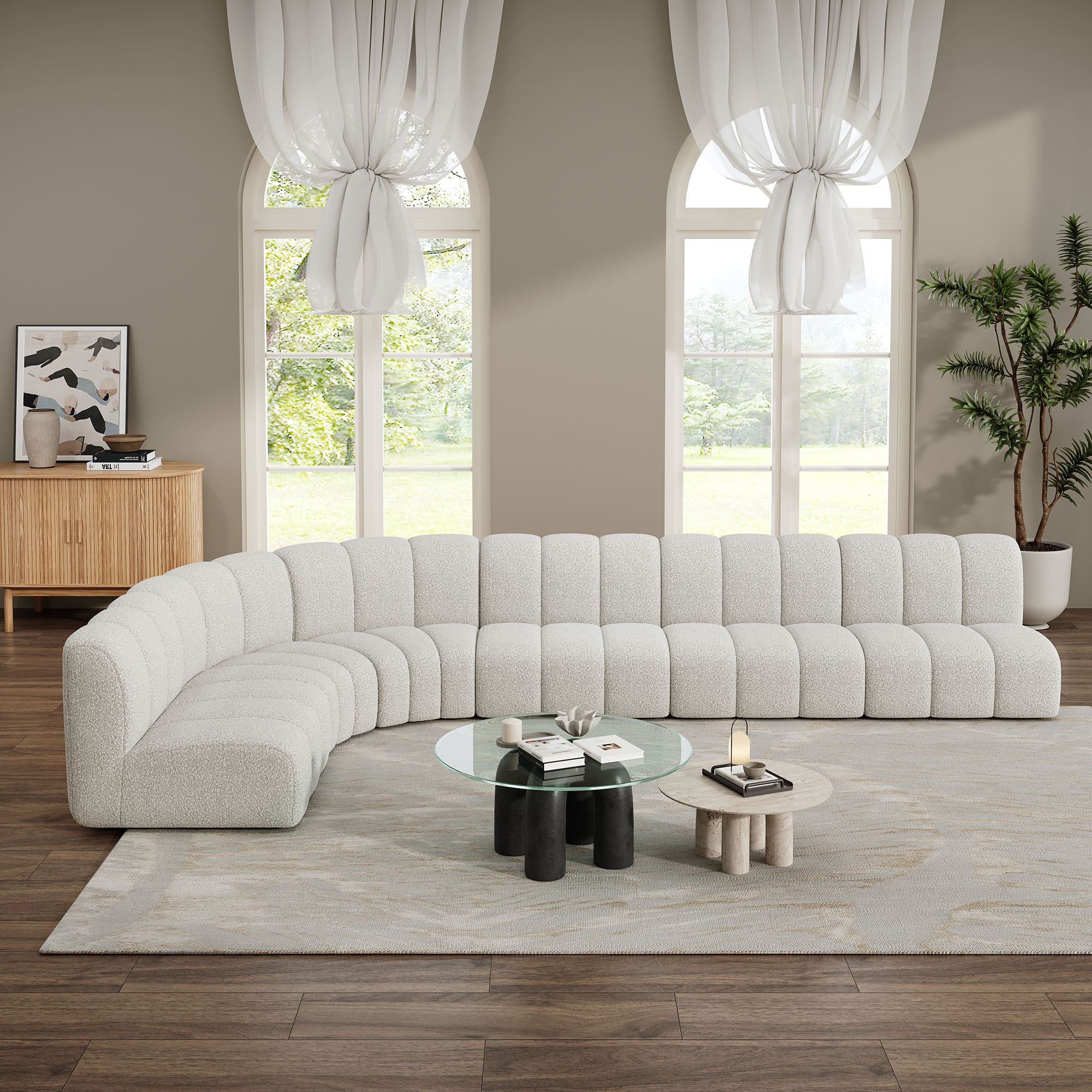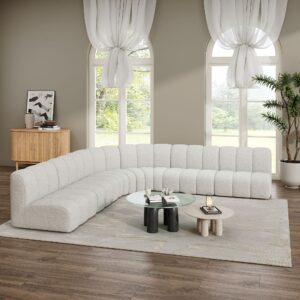 The Evan Grandeur Boucle Sofa Set is the ultimate blend of luxury and functionality. Designed to fit a variety of spaces, this sectional set features two wedge pieces and four straight sections, offering generous seating for family gatherings or a spacious lounge area. The soft boucle fabric and elegant white hue bring a sense of calm and purity to your living space, instantly creating a serene and welcoming atmosphere.