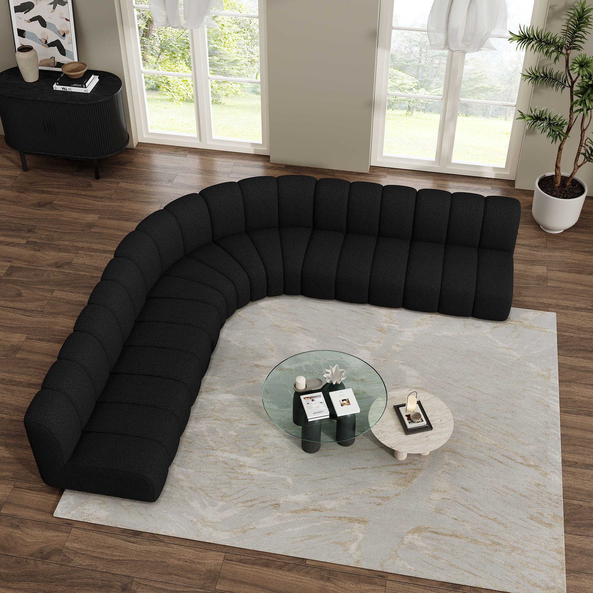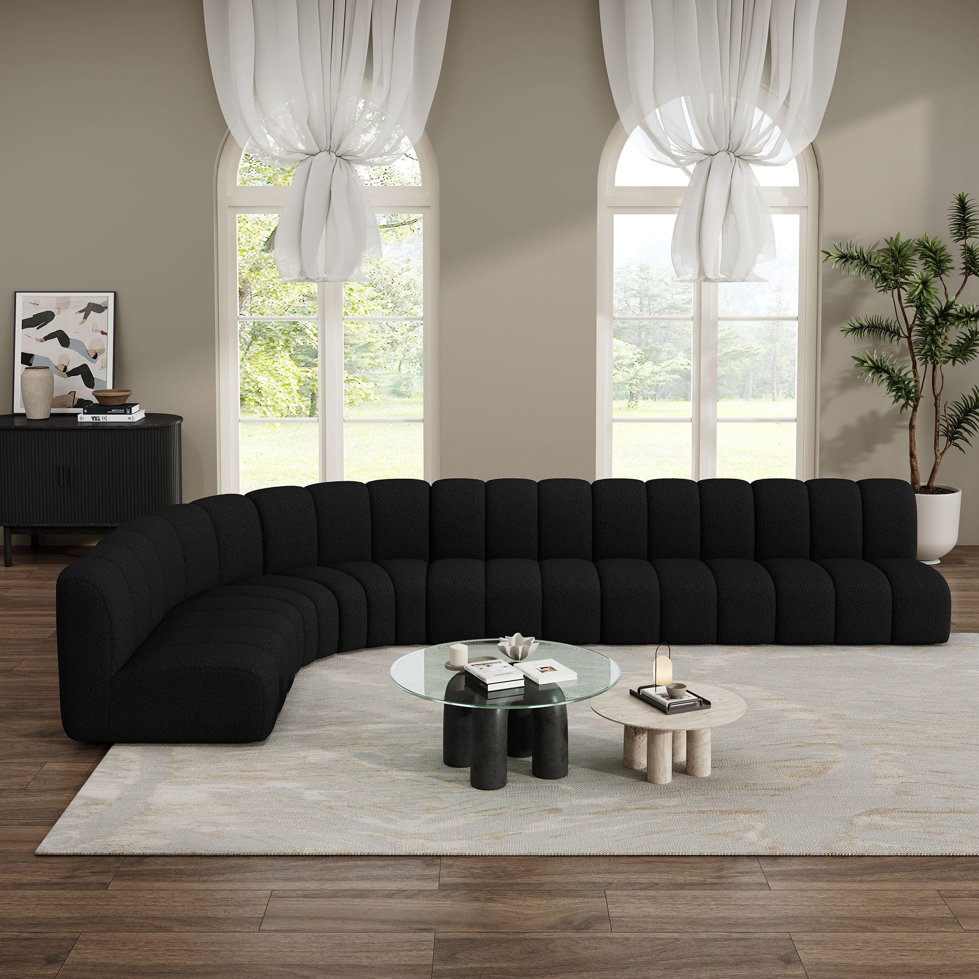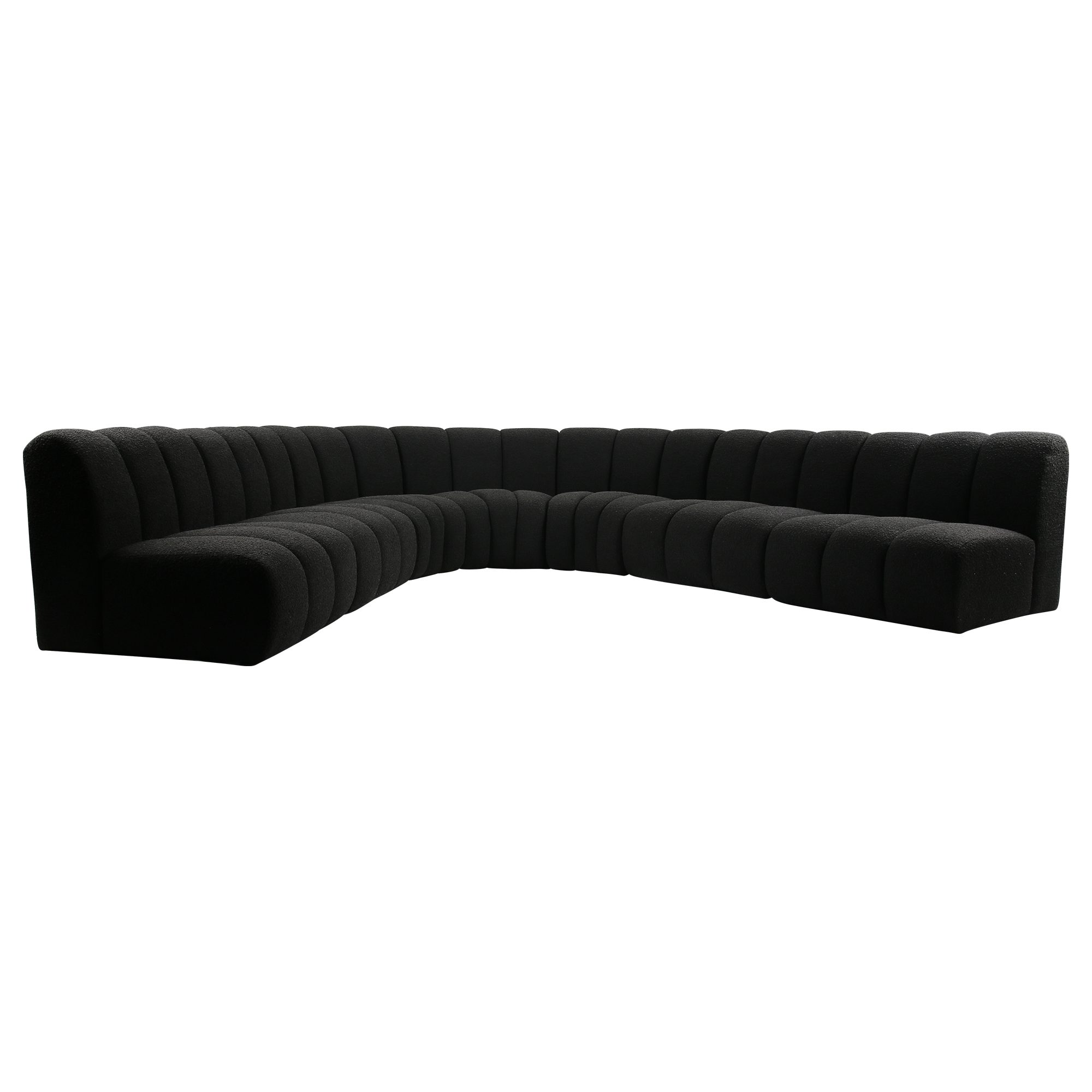 The Evan Grandeur Boucle Sofa Set is the ultimate blend of luxury and functionality. Designed to fit a variety of spaces, this sectional set features two wedge pieces and four straight sections, offering generous seating for family gatherings or a spacious lounge area. The soft boucle fabric and elegant white hue bring a sense of calm and purity to your living space, instantly creating a serene and welcoming atmosphere.