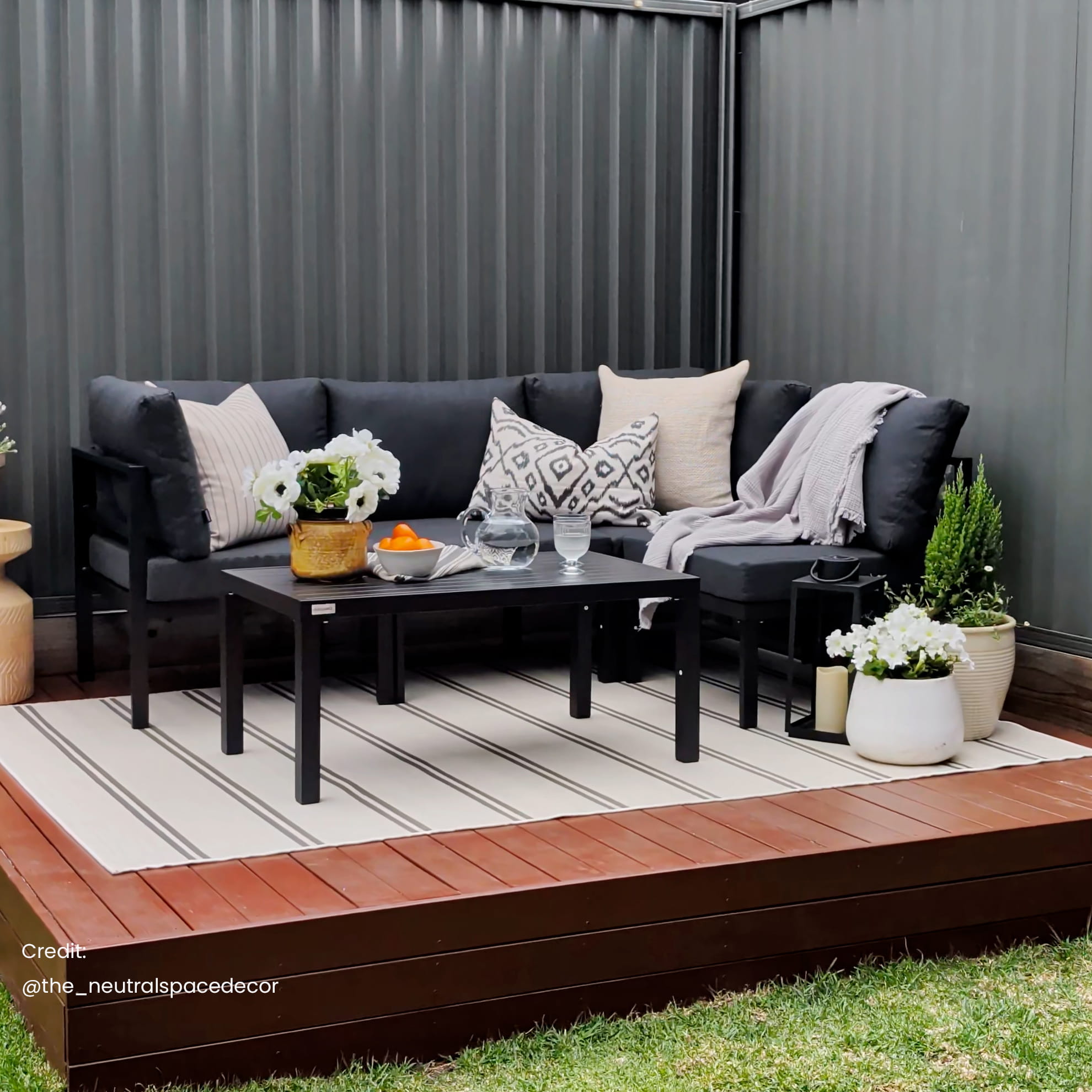 There is no better way to enjoy the fresh air than our minimalist black lounge set. It has been designed to suit any outdoor space with a versatile modular structure and sleek black design. You can use your new lounge set on the terrace, at the poolside or amongst the peaceful green space in your garden.
