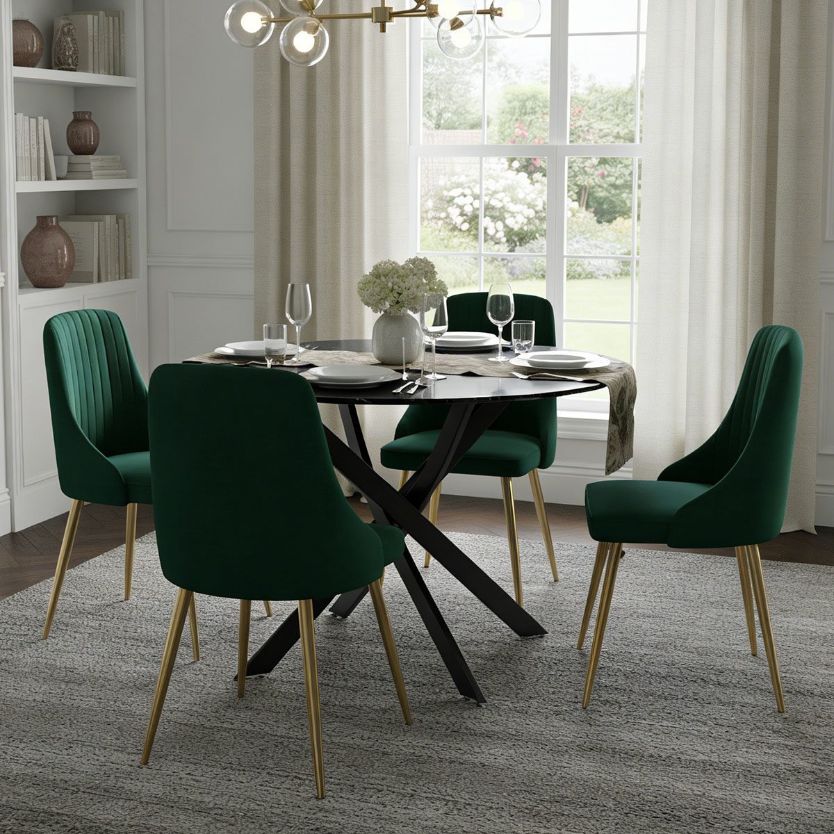 The centrepiece of this set is the circular table with a marble effect, which provides a sturdy base for meals and drinks. The set also includes four chairs, upholstered in soft green velvet. The chairs feature a curved back and armrests, ensuring ultimate comfort and support when sitting. The chairs also come with a sturdy steel frame, which makes them incredibly durable and long-lasting.