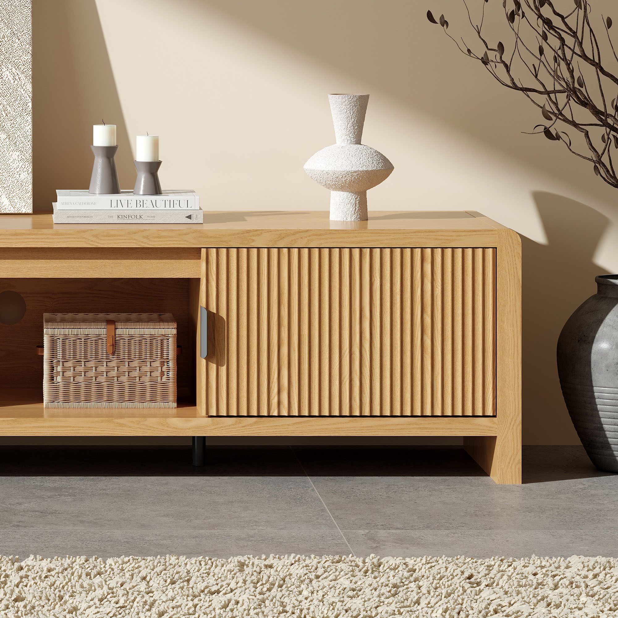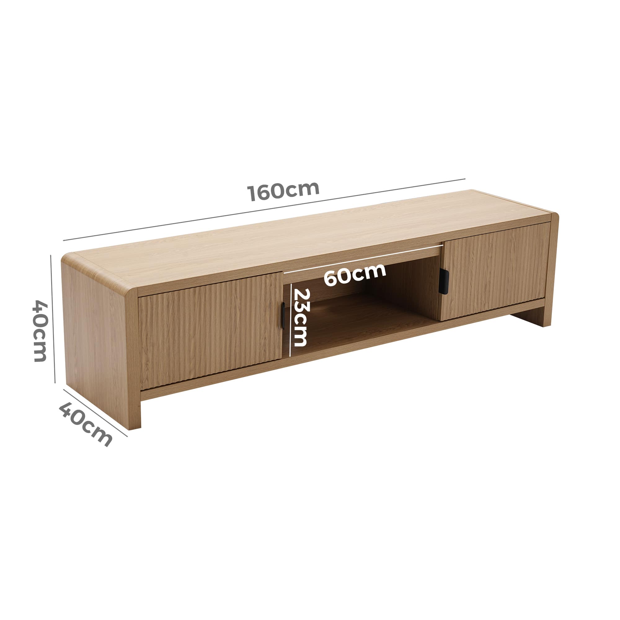 Thoughtfully arranged storage makes day-to-day living feel more organised. The centre open shelf is ideal for the devices you reach for most—streaming boxes, gaming consoles or speakers—while the discreet cable management ports at the back keep cords neatly tucked away. On either side, the doors feature a subtle fluted texture that adds movement and architectural interest. Behind them, generous compartments offer space for remotes, accessories or anything you prefer stored out of sight. The slim metal handles provide a graceful contrast against the timber tone, adding just a hint of sophistication.